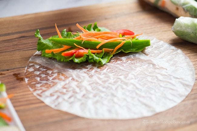 Check out the recipe box below for all the detailed step by step photographs. These are very helpful to visually see how to work with rice paper.