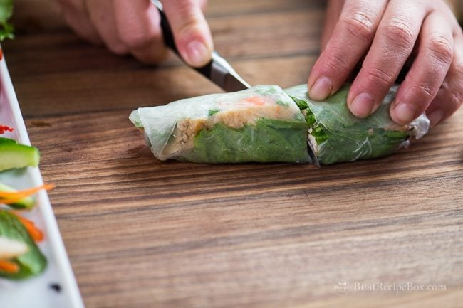 For storing: you can make them a few hours ahead of time and cover them with plastic wrap to keep them soft. If you’re making a lot of rolls, lay plastic wrap between the layers of spring rolls so they don’t stick together.