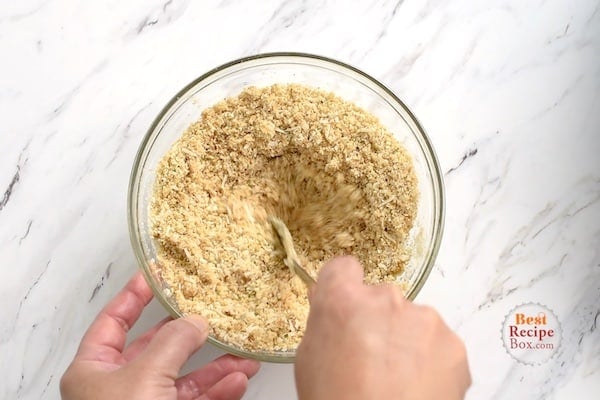 - Make the crumb topping: In bowl combine 1 cup breadcrumbs, 3 Tablespoons melted butter and 1/2 cup parmesan cheese. Set aside.
