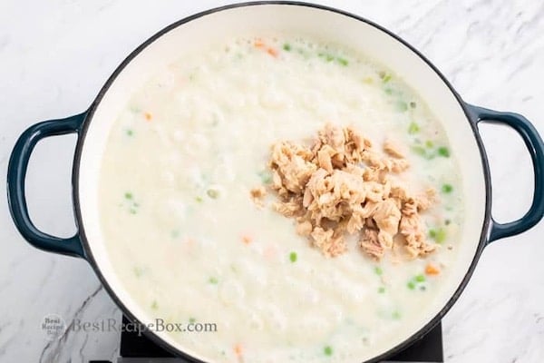 - Whisk 1/4 cup flour into the 1 cup of milk, then add the whisked mixture into the simmering pan with the veggies and broth. Stirring regularly, cook until mixture thickens, then add 12 oz. tuna, 1/2 teaspoon salt and 1/2 teaspoon pepper. Remove from heat and taste the mixture. Add more salt/pepper if needed.